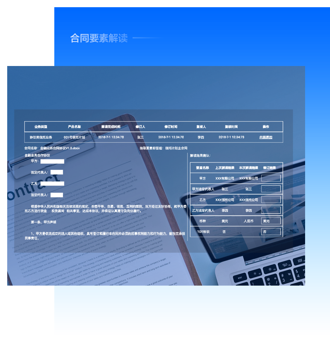 利用基于机器学习的自然语言处理技术,辅助信托各个业务部门解决合同全生命周期管理问题。AI赋能分别嵌入到合同要素智能解读、合同风险法律合规预审、领导批复意见落实、文本差异比对四个作业场景。帮助客户实现合同管理的人工智能赋能升级