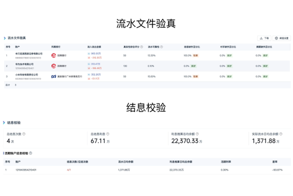 系统自动解析电子流水、执行数据审核,支持国内几千家银行流水识别,支持与打印纸质流水交叉比对